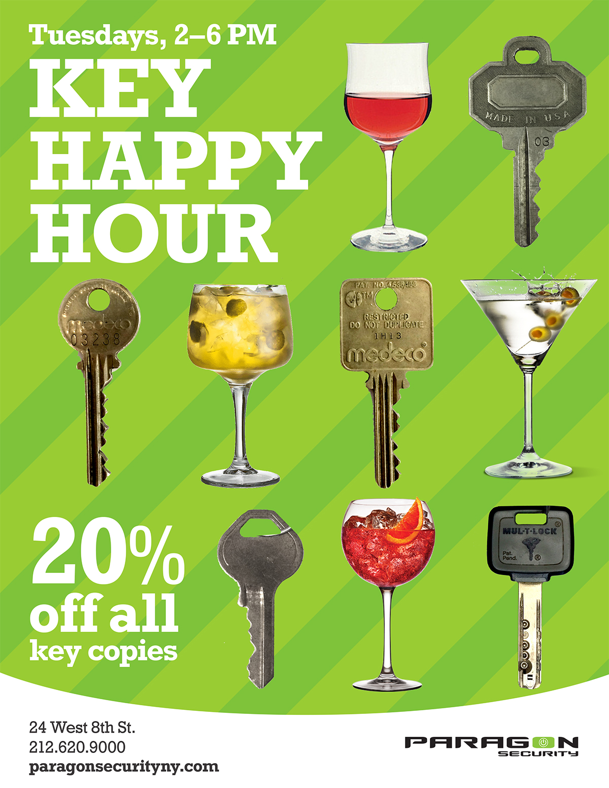 Join us at our 24 West 8th Street location, Tuesdays between 2-6pm for Key Happy Hour and receive 20% OFF all key copies. Whether you have a standard key or a rare antique key, our key duplication experts can help you.